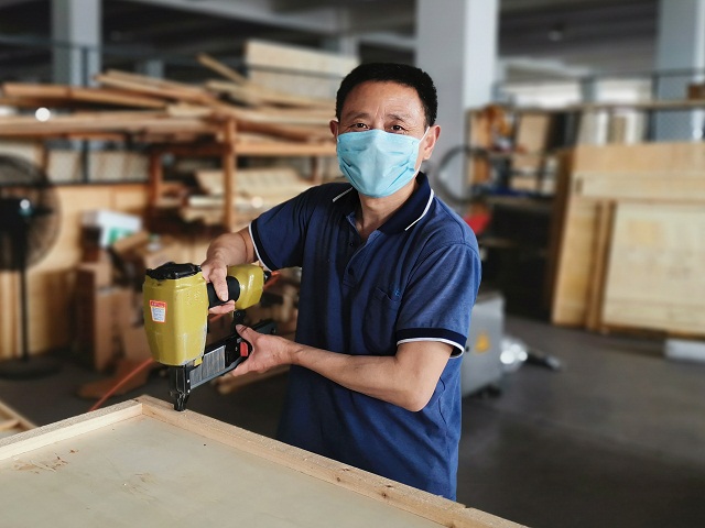 藺師傅為出去的每一臺機器裝箱打包,并在箱體上標明箱內(nèi)產(chǎn)品型號。采用這種整箱運輸?shù)姆绞?,機器、配件都能安全的運輸?shù)娇蛻艄S。