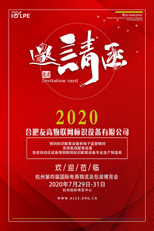 本次展會(huì),我公司由總經(jīng)理陳文正先生帶隊(duì)受邀參加“2020杭州國(guó)際電商物流及包裝展覽會(huì)”同期出席“一物一碼解決方案”演講主題“一物一碼,物聯(lián)世界”屆時(shí)合肥有高的工作人員會(huì)C館恭候您的光臨,我們誠(chéng)摯的歡迎業(yè)內(nèi)朋友過來(lái)交流!