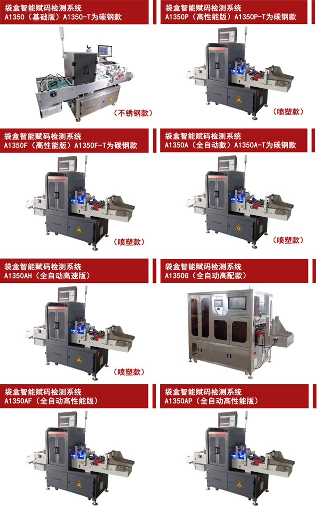 A1350智能賦碼檢測(cè)系統(tǒng)可為客戶提供多種需求的選擇,且在眾多客戶現(xiàn)場(chǎng)均有成熟的應(yīng)用案例,具體產(chǎn)品型號(hào)如下所示: